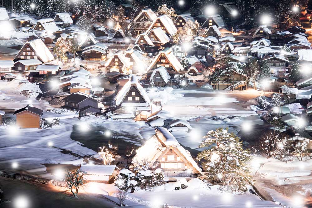 หมู่บ้านมรดกโลกชิราคาวาโกะ (Shirakawa-go) จะถูกแต่งแต้มด้วยแสงไฟระยิบระยับทั่วหมู่บ้าน บ้านทรง “กัสโชสึคุริ” ที่มีหลังคาสูงและหิมะปกคลุม จะเปล่งประกายราวกับอยู่ในโลกนิทาน