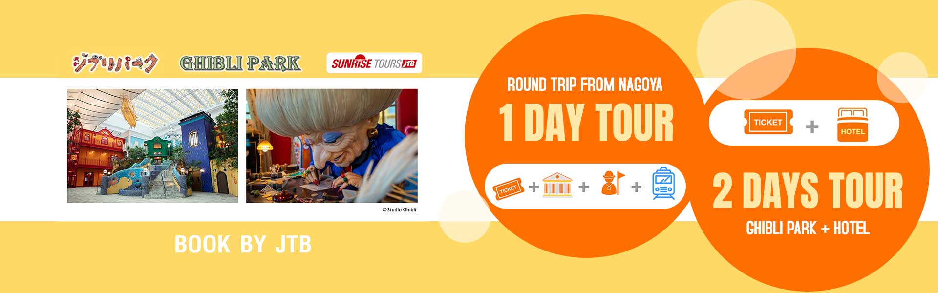 ทัวร์ที่จะพาทุกท่านท่องไปยังดินแดนอนิเมะขวัญใจผู้คนทั่วโลก Ghibli Park ณ เมืองไอจิ มีทั้งหมด 5 โซน คือ Ghibli's Grand Warehouse, Hill of Youth, Dondoko Forest, Mononoke Village และ Valley of Witches ที่ถูกสร้างขึ้นจากฉากสุดประทับใจจากอนิเมะชื่อดังของ Ghibli Studio ต่อด้วยการสานฝันวัยเด็ก The Aichi Museum of Flight พิพิธภัณฑ์เครื่องบิน ที่จะได้ชมเครื่องบิน YS-11 เครื่องบินบรรทุกผู้โดยสารลำแรกของญี่ปุ่น และเรียนรู้ประวัติของ จิโระ โฮริโคชิ บิดาแห่งเครื่องบินรบซึ่งเป็นแรงบันดาลใจของภาพยนตร์เรื่อง "The Wind Rises" เพลิดเพลินกับการจัดกิจกรรมต่างๆ มากมาย