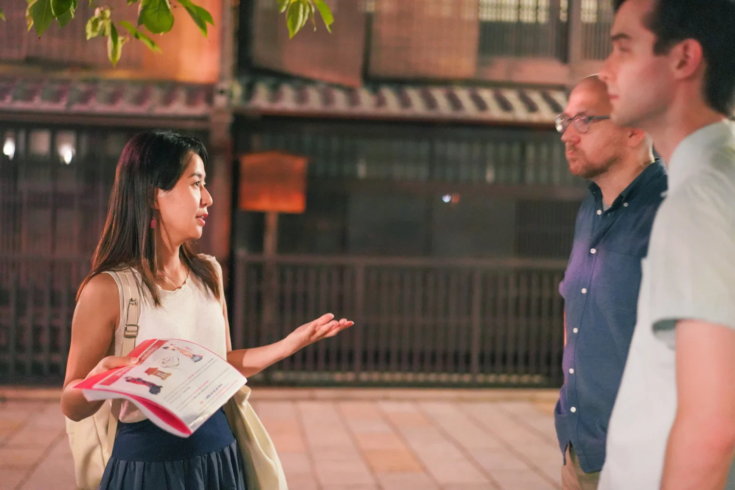 นัดพบกันที่สถานี Gion-Shijo จากนั้นออกเดินเที่ยวชมย่านกิออน—ชื่นชมสถาปัตยกรรมบ้านไม้แบบ มาจิยะ (machiya) และถนนเก่าแก่ในย่านกำเนิดของไมโกะ ระหว่างทางไกด์ท้องถิ่นจะเล่าถึงที่มาและประวัติของไมโกะ พร้อมถ่ายทอดมุมมอง เสน่ห์ และรายละเอียดที่ซ่อนอยู่ ซึ่งแม้แต่นักท่องเที่ยวชาวญี่ปุ่นเองก็อาจไม่ได้สัมผัสมาก่อน